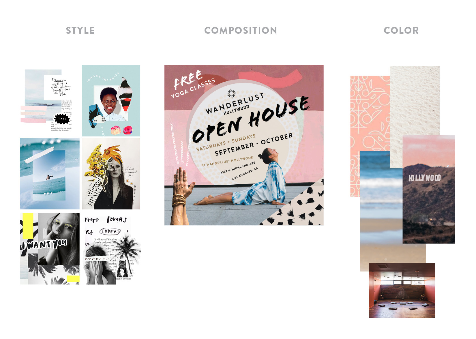 A series of designed assets for a big marketing push of Wanderlust Hollywood's Open House classes. The ask was for a fun collage style with some slight eye-catching animations. I pitched concepts with mood boards and, when approved, implemented the chosen direction into several different sizes and formats for ads, email, event landing pages, and flyers.
